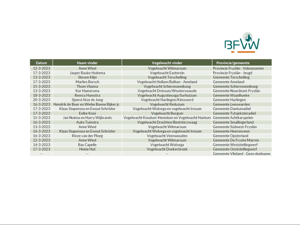 Op zondag 12 maart 2023 barstte het seizoen van de eerste kievitseieren in Fryslân los. Hierboven treft u een overzicht aan van de data, de vinders, de vogelwacht waar de vinder lid van is en welke gemeente het Fryslân het betreft.